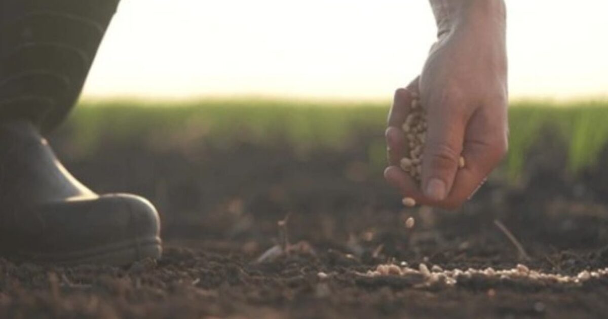Hand scattering seeds into rich soil in a field during sunrise, symbolizing agricultural practices and planting.