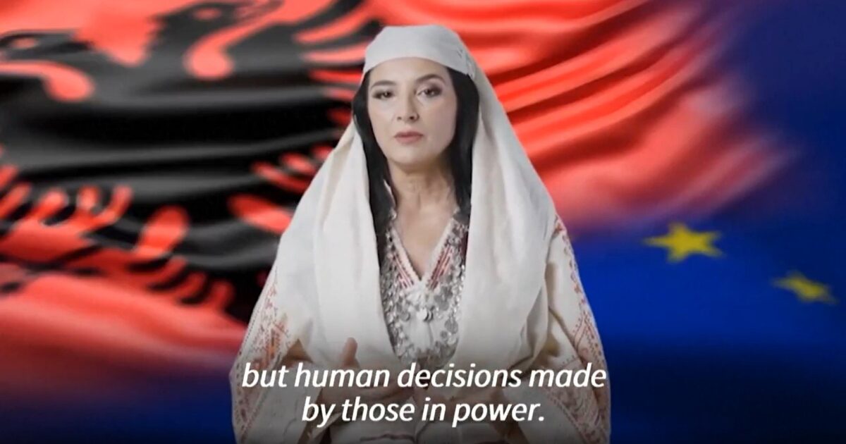 A woman in traditional attire speaks against a backdrop of the Albanian flag, highlighting the impact of human decisions by those in power.