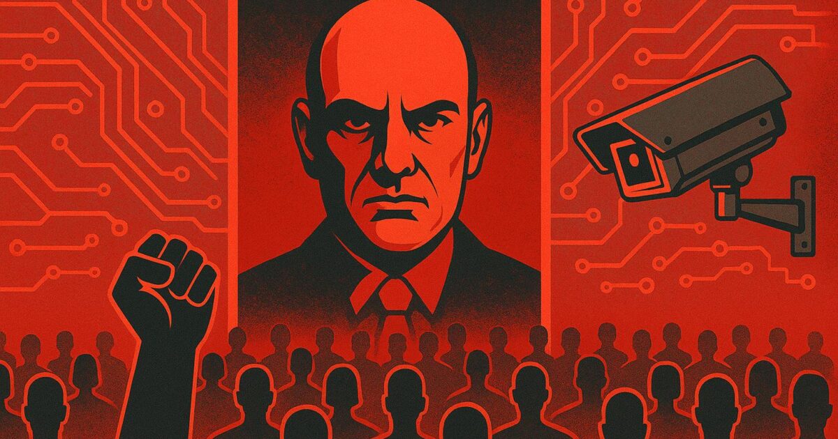 A powerful illustration depicting a stern figure against a red background, surrounded by a crowd, surveillance camera, and circuit patterns, symbolizing authority and control.