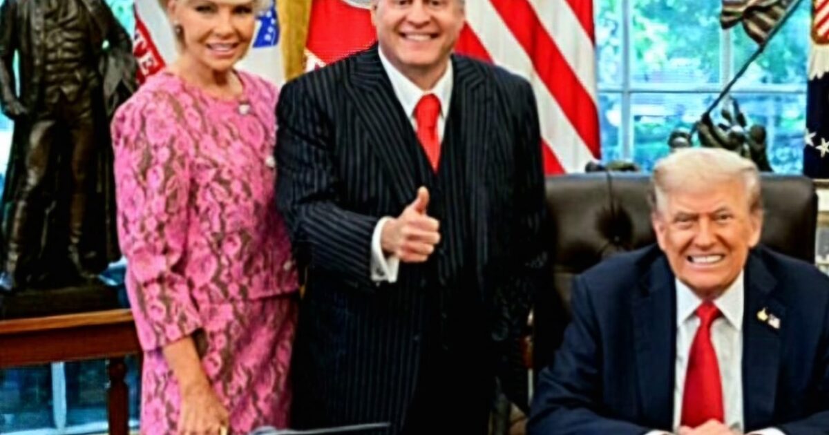 A group photo in the Oval Office featuring Donald Trump with two smiling individuals, surrounded by American flags and historical decor.