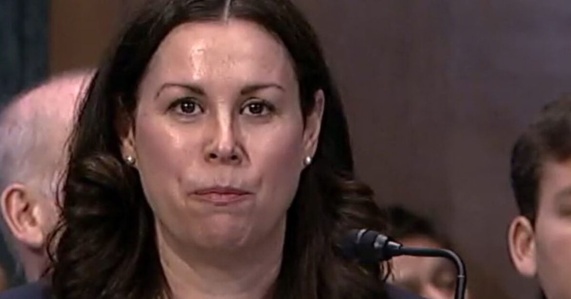 Woman speaking at a Senate hearing, with a serious expression and microphone in front, while audience members are visible in the background.