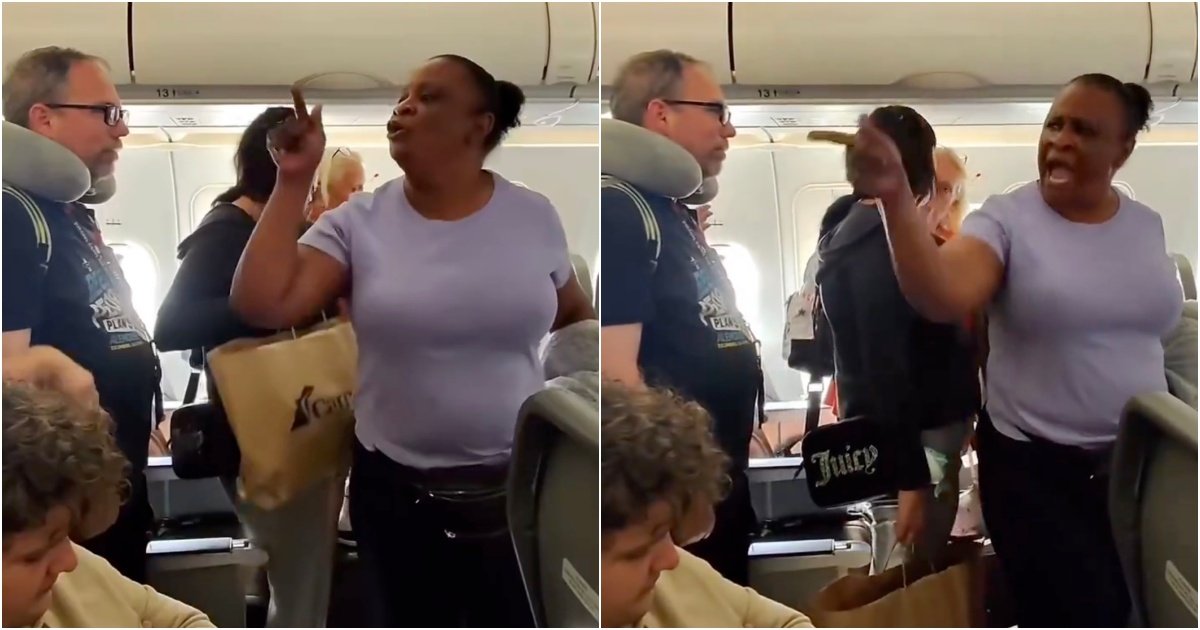 A passenger argues with fellow travelers after blocking the airplane aisle and refusing to let anyone deplane until her daughter, seated several rows behind, was allowed to exit first. (Image used under fair use for reporting and commentary)