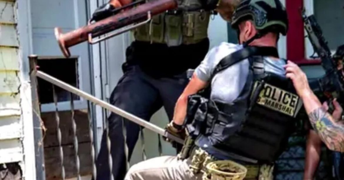 U.S. Marshals conduct an operation, showcasing tactical teamwork and law enforcement efforts during a significant police action.
