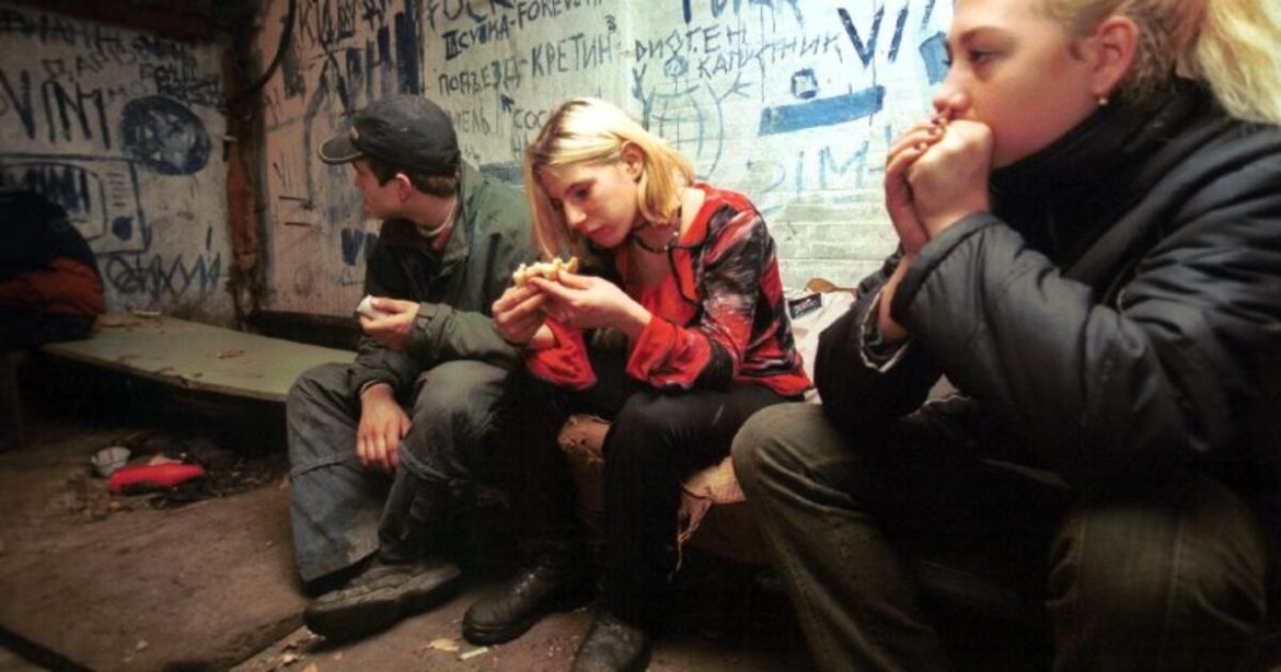 Three young people sit in a dimly lit room with graffiti-covered walls, sharing food and deep in thought.