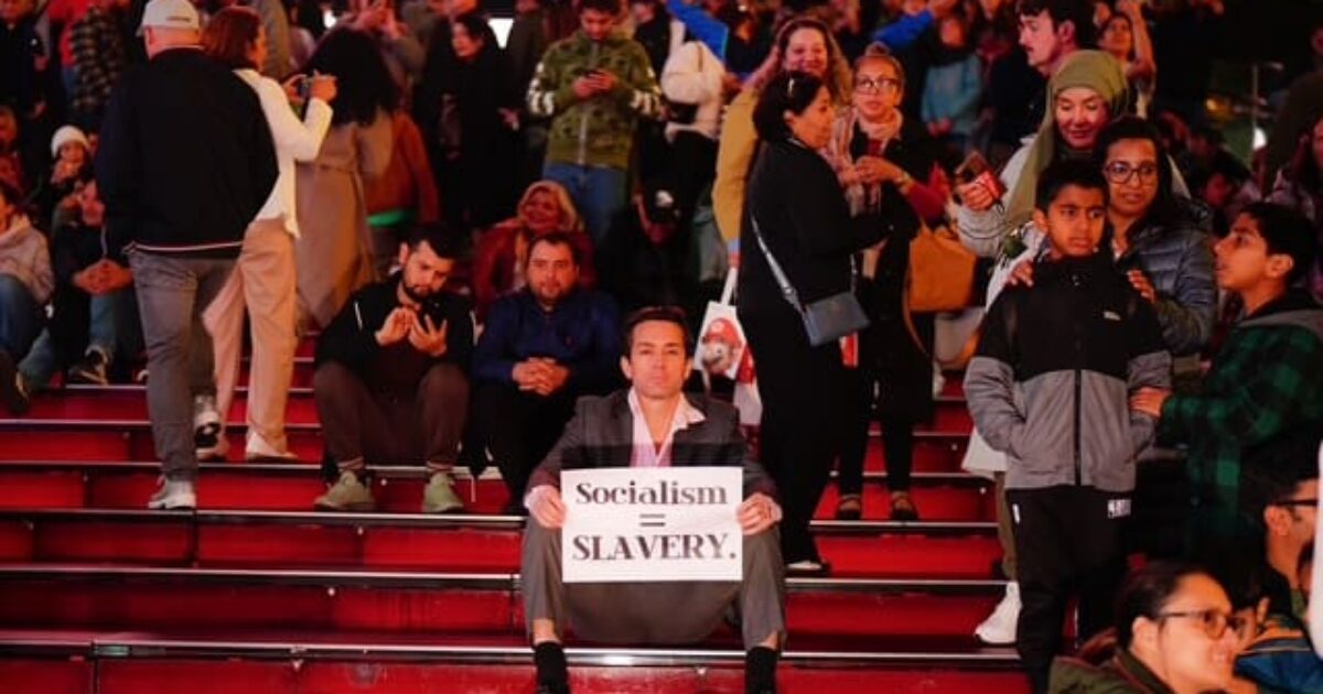 Protester holding a sign reading "Socialism = Slavery" sits on steps in a crowded public space, surrounded by a diverse audience engaged in conversation.