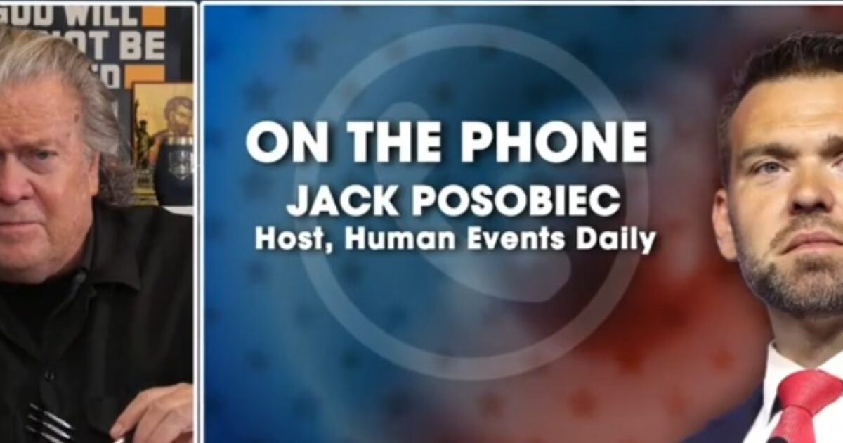 Steve Bannon and Jack Posobiec discuss current events during a phone interview on a podcast, with a backdrop of patriotic imagery.
