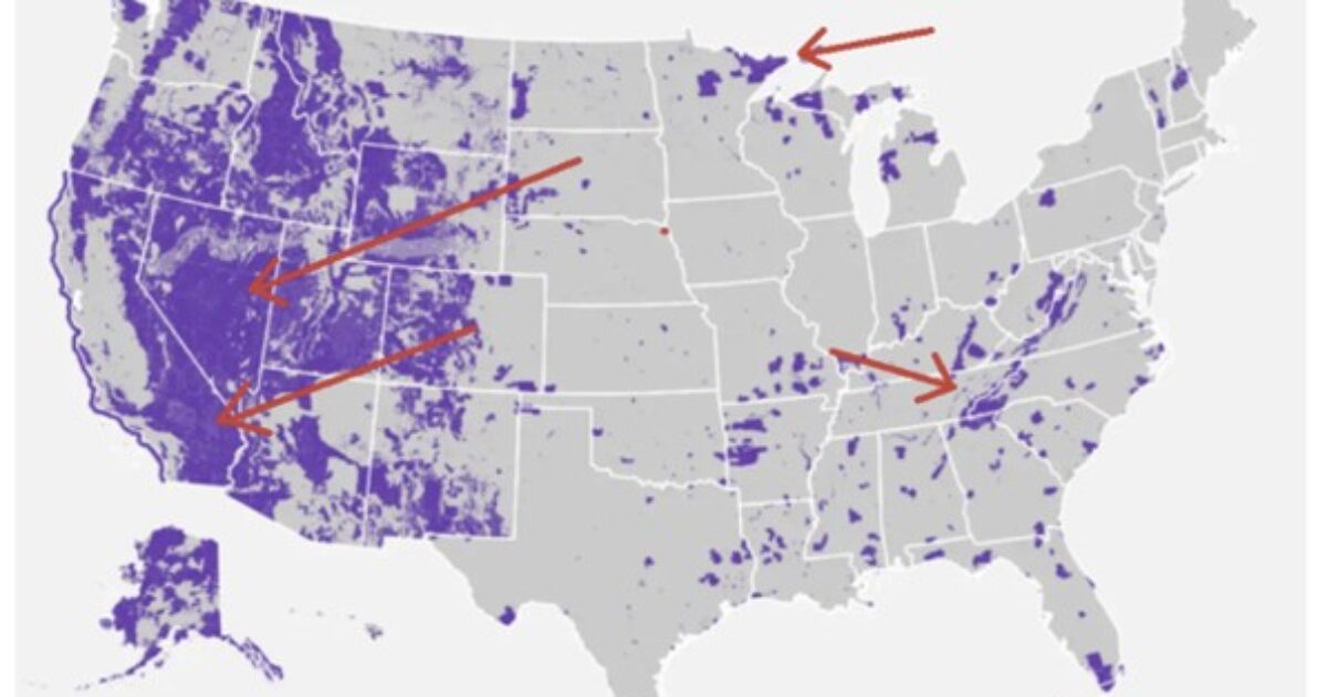 Map showing areas of interest in the United States with highlighted regions in purple, indicating specific locations or data points.