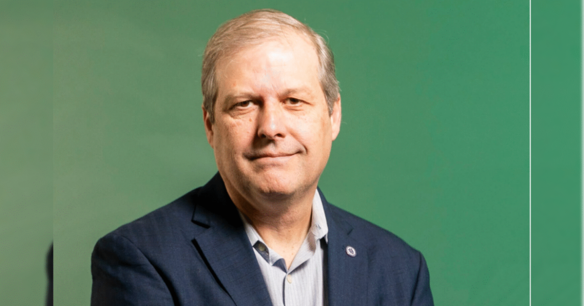 Professional man in a navy blazer poses confidently against a green background, showcasing a friendly expression and approachable demeanor.