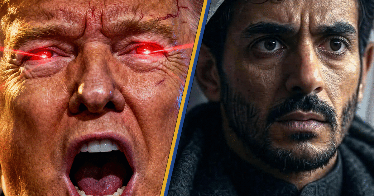 Dramatic split image featuring a furious man with glowing eyes on the left and a serious man with a beard on the right, conveying intense emotions.