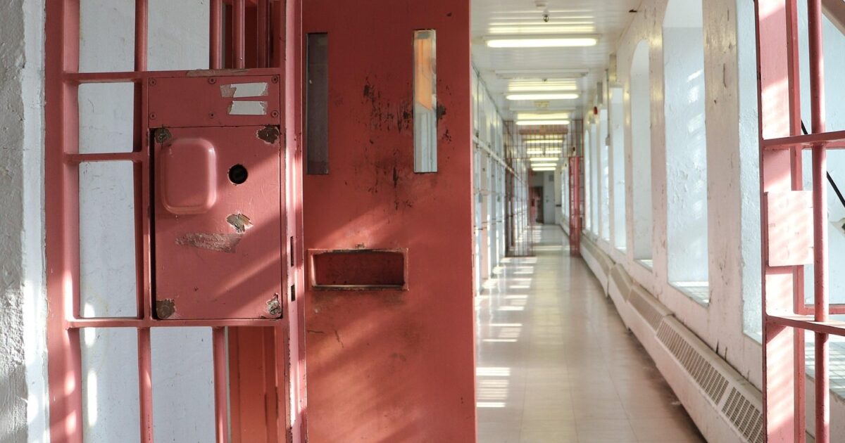 Interior view of a prison corridor featuring pink metal bars and doors, illuminated by natural light streaming through windows.