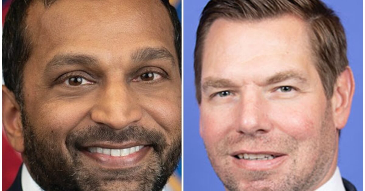 Official portraits of FBI Director Kash Patel and Rep. Eric Swalwell (D-China). Credits: FBI and U.S. House of Representatives