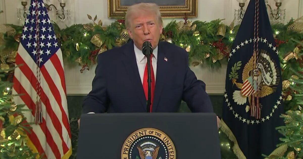 Donald Trump delivering a speech at the White House, decorated for the holidays, with the U.S. flag and presidential seal in the background.