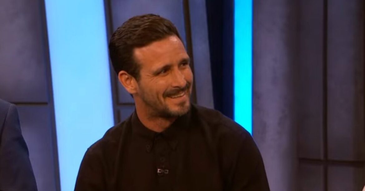 Smiling man in a black shirt sitting on a talk show set with blue lighting in the background.