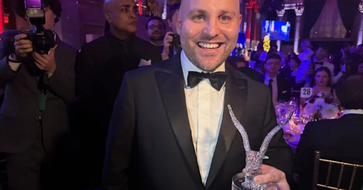 Man in a tuxedo smiling and holding an award at a formal event, surrounded by photographers and guests in a decorated venue.