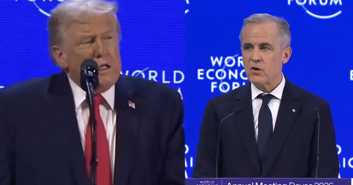 Donald Trump and Mark Carney speaking at the World Economic Forum Annual Meeting in Davos 2026, addressing global economic issues.