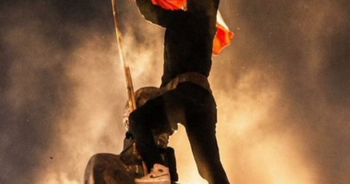 Protester climbing a statue while waving a flag against a backdrop of smoke and light, symbolizing activism and social change.
