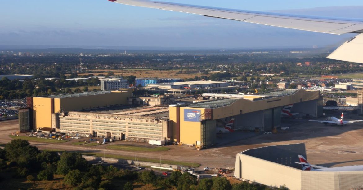 Aerial view of British Airways maintenance hangars and aircraft at an airport, showcasing the expansive facility and surrounding landscape.