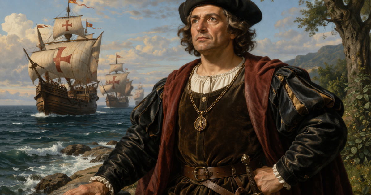 Portrait of a historical figure in period attire, standing by the sea with ships in the background, symbolizing exploration and discovery.