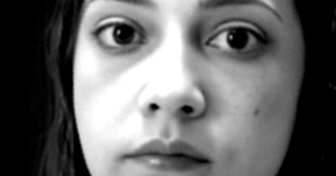 Close-up portrait of a woman with dark hair and expressive eyes, captured in black and white for dramatic effect.