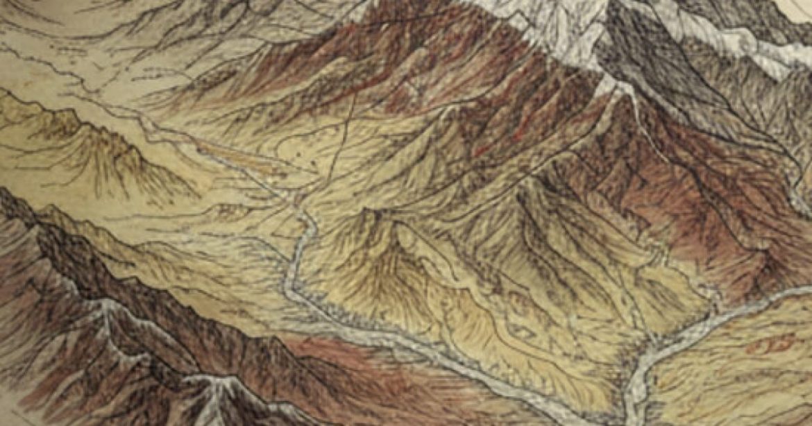 Detailed topographic map showcasing a mountainous landscape with valleys and rivers, highlighting natural features and terrain variations.